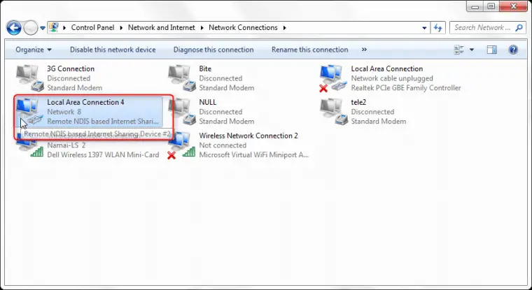 1. Go to network connection properties and find how the R210 modem connection (Windows Mobile-based Internet Sharing Device) is named.